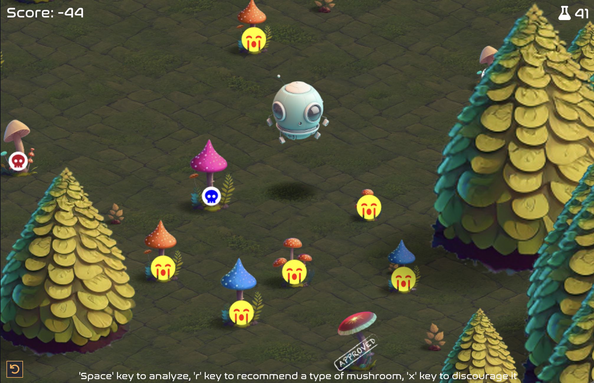 With a click, the positive or negative presence of the molecule on a particular mushroom is revealed. The final proportion of mushrooms containing the desired molecule is calculated as the game progresses.