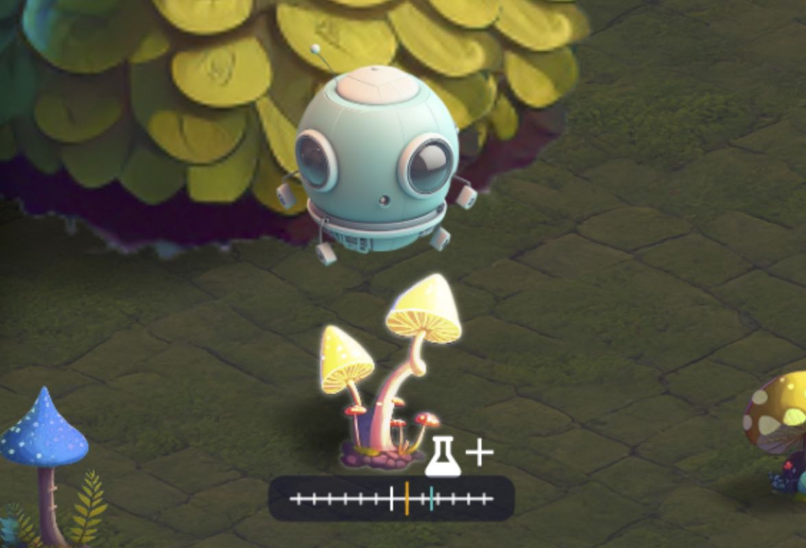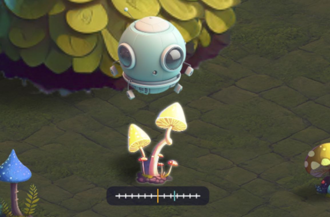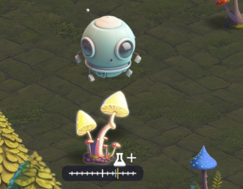In a new game mode, a cursor appears when the player approaches a mushroom. It starts at an initial position corresponding to 0. This represents the prior belief we have before conducting the first test on a given species.